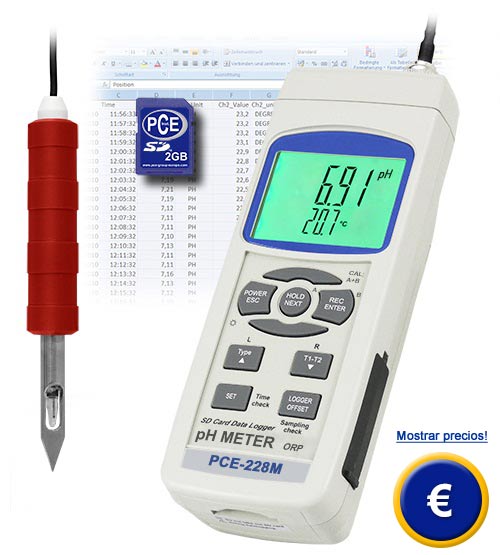 Este pH metro PCE-228 M es un aparato de mano de muy sencillo manejo para el sector de la alimentación. Los valores de pH y temperatura del pH metro pueden ser leídos en la gran pantalla LCD o almacenados directamente en la tarjeta SD (formato Excel). Otra opción es transferir en tiempo real los datos a un PC o un portátil mediante la interfaz RS-232 como componente opcional. La compensación de temperatura se realiza de manera manual o automática por medio de un sensor de temperatura de acero noble incluido en el envío. Todo ello proporciona una medición de pH de gran fiabilidad en alimentos como la carne, el embutido, el queso... Este pH metro se alimenta por baterías (el envío incluye una batería de bloque de 9 V).